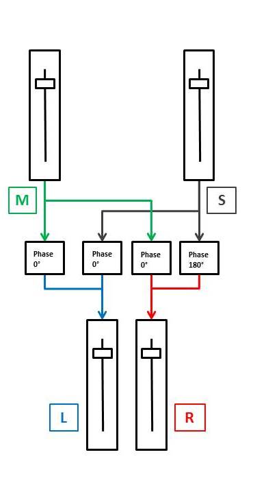Du encodierst die Signale nach der oben genannten Formel. Du routest Dein Mittensignal auf 2 Busse. Dasselbe machst Du mit dem Seitensignal, wobei Du einen Bus des Seitensignals um 180° Phasendrehst. Nun schickst Du den ersten Bus des Mittensignals und den ersten Bus des Seitensignals auf eine Subgruppe und erhältst somit den linken Kanal. Den zweiten Bus des Mittensignals und den zweiten um 180° gedrehte Bus des Seitensignals schickst Du wiederum auf eine Subgruppe und erhältst somit den rechten Kanal. Denk daran, dass die Signale doppelt so laut sein werden wie die Ausgangssignale. Zieh den Fader somit 6db runter.