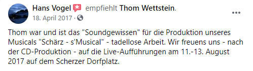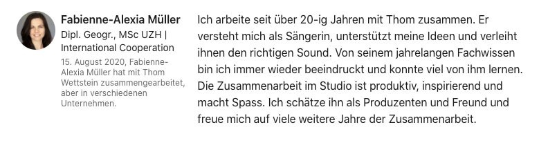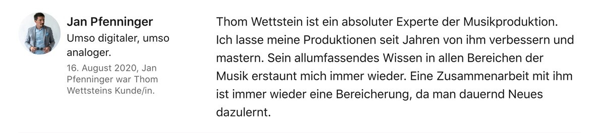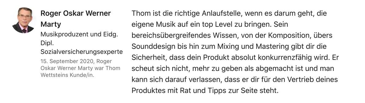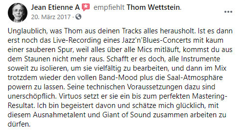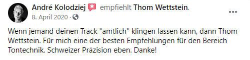 «Vielen Dank fürs Aufnehmen, Mischen und Mastern unseres Albums. Ich höre die Songs immer wieder gerne, sei es über die Heimanlage, im Auto oder im Club. Top!»