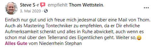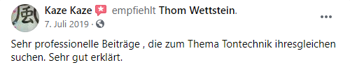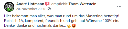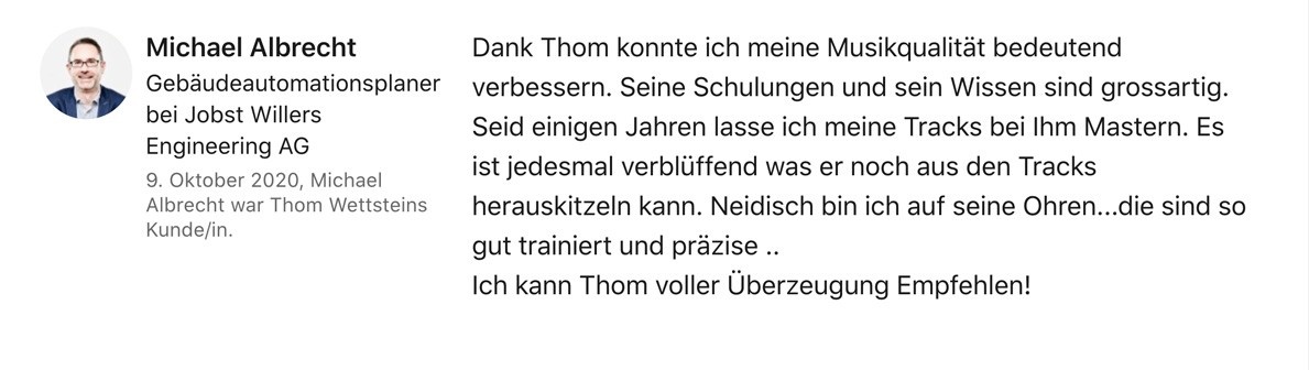 «Ich bin echt sprachlos, der Track klingt sehr sehr gut gemastert. Ich kann mir den Track immer und immer wieder anhören. Ich danke dir vielmals fürs Mastering und für deine tollen Feedbacks.»